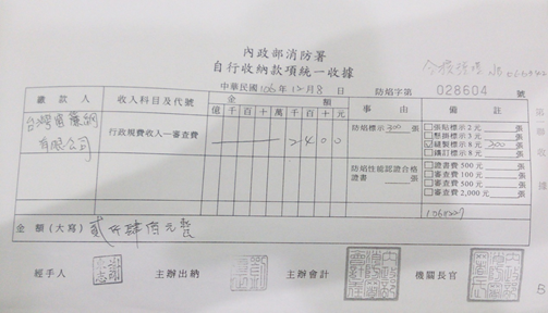 (沒車防焰窗簾布,單賣防焰標籤。是違規偽造行為,防焰基金會與消防局會取消該公司資格,並追查相關責任)